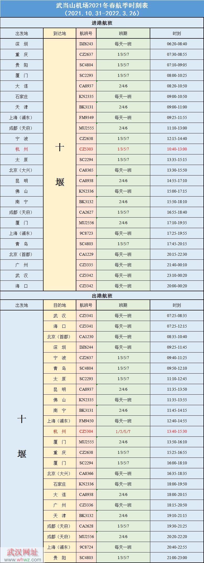 武當山機場最新航季時刻表